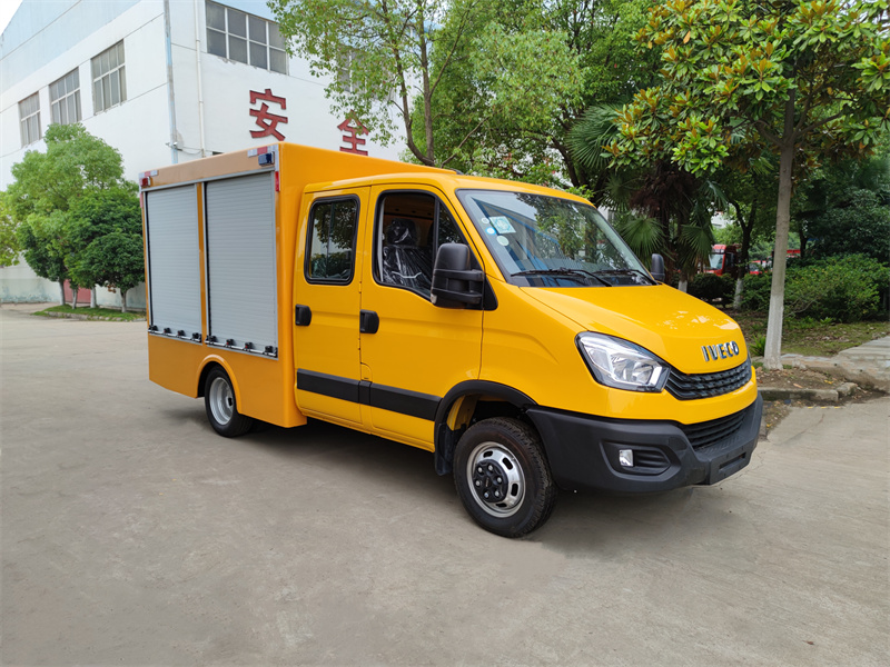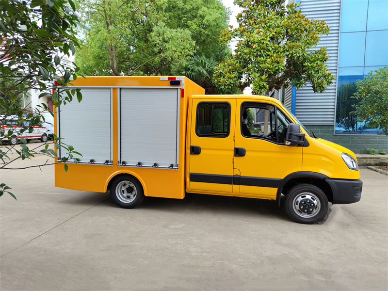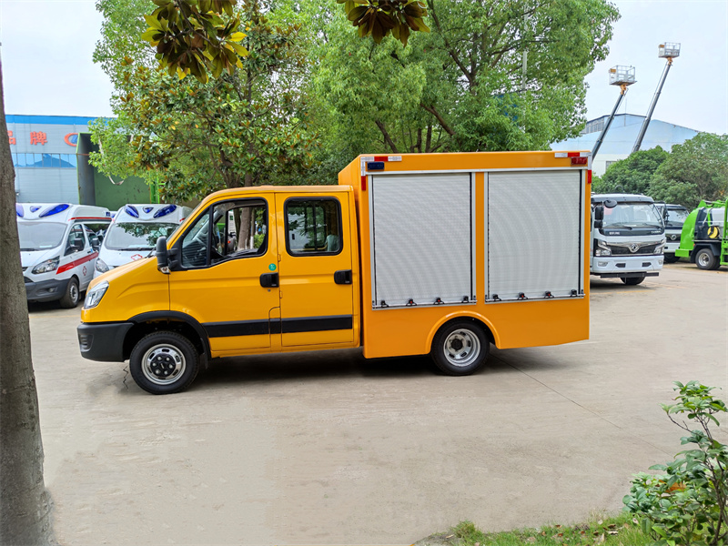 依維柯雙排救險車-流量1000方每小時,該車配備工程標識燈、發電機組、空壓機、電焊機、等離子系統等專用設備及控制系統,主要用于應急救險救援,應急排水作業。