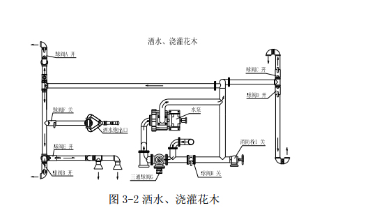 (2)灑水、澆灌花木 在灑水和澆灌花木時(shí),其操作程序是:調(diào)節(jié)三通球閥 G 到如圖位置(注意:三通球閥 凹坑所對(duì)方向關(guān)閉),關(guān)閉鋁合金球閥 H 和消防栓 I,打開不銹鋼球閥 A、B、C、D、E,打 開鋁合金球閥 H,踏下離合,打開取力器開關(guān),慢慢松開離合(千萬不可過快,否則將會(huì) - 6 - / 9 湖北程力專用汽車有限公司系列灑水車使用說明書 損壞取力器或變速箱),使水泵開始工作,即可向?qū)崿F(xiàn)灑水和澆灌花木的功能,停止工作 后開關(guān)回位。 工作水路示意:水經(jīng)過罐體出口、三通球閥 G、過濾網(wǎng)、泵、前沖后灑和花撒。(其中 H、 I 關(guān)閉)。 圖 3-2 灑水、澆灌花木