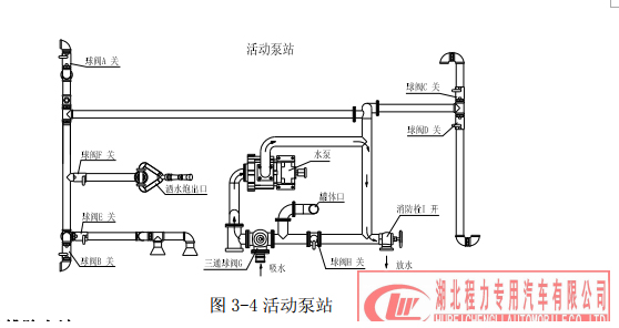 (4)活動(dòng)泵站 做活動(dòng)泵站時(shí),其操作程序是:在三通球閥 G 處接一膠管,調(diào)節(jié)三通球閥 G 到如圖位 置(注意:三通球閥凹坑所對(duì)方向關(guān)閉),關(guān)閉不銹鋼球閥 A、B、C、D、E、F 和鋁合金球閥 H,打開消防栓 I,接出口管。踏下離合,打開取力器開關(guān),慢慢松開離合(千萬不可過快, 否則將會(huì)損壞取力器或變速箱),使水泵開始工作,即可實(shí)現(xiàn)活動(dòng)泵站的功能,停止工作后開 關(guān)回位。 工作水路示意:水經(jīng)過三通球閥 G、過濾網(wǎng)、泵、消防栓 I。(其中 A、B、C、D、E、F、 H 關(guān)閉)。