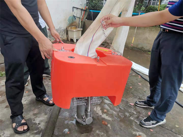 3. 待車輛停放好后將主車熄火,將車箱內水泵移至到需作業地區,將水帶接頭穿過浮體后,連接水泵接口,然后將浮體固定于水泵上,最后掛上手繩(防汛繩)防止水泵移(浮體及安裝方法見示圖)